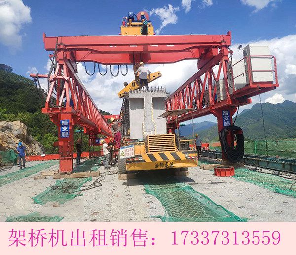 四川達州免配置架橋機廠家17337313559關于架橋機施工安全控制要點:1、架橋機屬大型橋梁起吊專用設備,起吊作業必須分工明確,統一指揮,并設專職指揮員、專職操作員、專職電工和專職安全檢查員。施工前對參加人員應進行安全技術交底,有嚴格的施工組織及防范措施,確保施工安全。架橋機在進場后必須經過安全部組合驗收、試吊并經過有關部門辦理驗收合格證后方可投入使用。2、前、中支腿的橫向運行軌道鋪設要求水平,并嚴格控制間距,兩條軌道必須平行。架橋機縱向就位必須嚴格控制位置尺寸,確保混凝土預制梁安裝順利就位。3、架橋機主梁空載縱向前移時,應調整縱坡<3%,不滿足時應調整軌道至此要求。安裝橋梁有上下縱坡時,架橋機縱向位移要有防止滑行措施,運梁平車行走輪處要有楔鐵作保護。4、架橋機縱向移動要作好一切準備工作,要求一次到位,不允許中途停頓。5、架橋機起吊天車攜帶箱梁縱向運行時,前支腿應與橫移軌道拉緊。架橋機工作前,應調整前、中支腿高度,使架橋機主梁縱向坡度<1%。6、架橋機前支腿支好后,應用枕木或自制鋼梁在支撐架和行走箱之間作保護。架橋機橫移走行梁下必須采用枕木按照“井”字架進行搭設,保證橫梁下方支墊平穩、密實牢固,不脫空,由于橫坡不平穩的地方采用木楔調整。